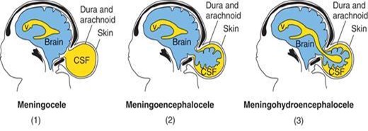 Cranium bifida with meningoencephalocele occurs when the meninges and brain protrude through the skull defect and form a sac filled with CSF. This defect usually comes to medical attention within the infant's first few days or weeks of life. The outcome is poor (75% of the infants die or have severe intellectual disability).