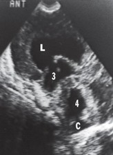 Congenital aqueductal stenosis(Figure 7.30) is the most common cause of congenital hydrocephalus. This type may be transmitted by an X-linked trait, or it may be caused by cytomegalovirus or toxoplasmosis. The sonogram (Figure 7.30) shows dilated lateral ventricles (L), dilated third ventricle (3), but normal-size fourth ventricle (4). Therefore, obstruction at the cerebral aqueduct is presumed.