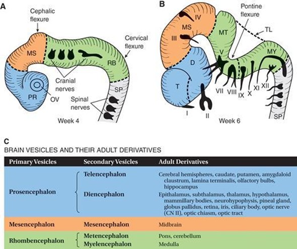 A. Three-vesicle stage of the brain in a 4-week-old embryo. Divisions are indicated by dashed lines. PR 5 prosencephalon (blue); MS 5 mesencephalon (orange); RB 5 rhombencephalon (green); SP 5 spinal cord; OV 5 optic vesicle. B. Five-vesicle stage of the brain in a 6-week-old embryo. Divisions are indicated by dashed lines. Cranial nerves (CN) are indicated by Roman numerals. CN VI is not shown because it exits the brain stem from the ventral surface. T 5 telencephalon; D 5 diencephalon; MS 5 mesencephalon; MT 5 metencephalon; MY 5 myelencephalon; TL 5 tela choroidea; SP 5 spinal cord. C. Table indicating the brain vesicles and their adult derivatives.