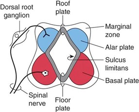 The basal plate gives rise to motor neuroblasts of the ventral and lateral horns (general somatic efferent [GSE] and general visceral efferent [GVE] cell regions).