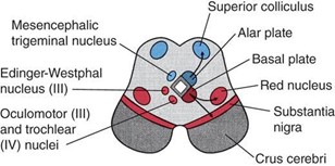 The trochlear (CN IV) nucleus and a portion of the sensory mesencephalic trigeminal (CN V) nucleus originate in the metencephalon and secondarily migrate into the mesencephalon.