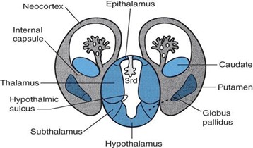 Hypothalamus develops from the alar plate and floor plate ventral to the hypothalamic sulcus. The hypothalamus gives rise to the following: hypothalamic nuclei, mammillary bodies, and neurohypophysis.