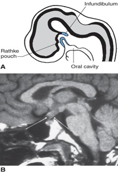 Anterior lobe (adenohypophysis) develops from Rathke’s pouch, which is an ectodermal diverticulum of the primitive oral cavity (stomodeum). The diagram (Figure 17.17A) shows a midsagittal view of an embryo at week 6 indicating Rathke’s pouch and the infundibulum. Remnants of Rathke pouch may give rise to a craniopharyngioma. A craniopharyngioma is the most common supratentorial tumor occurring in childhood and is the most common cause of hypopituitarism in children. The MRI (Figure 7.17B) shows a craniopharyngioma (arrows), which lies suprasellar in the midline, compressing the optic chiasm and hypothalamus.