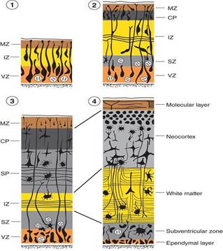 The diagram shows the temporal sequence (early to late: 1–4, respectively) of cytodifferentiation of the cerebral cortex. MZ = marginal zone; IZ = intermediate zone; VZ = ventricular zone; CP = cortical plate; SP = subplate zone; SZ = subventricular zone.